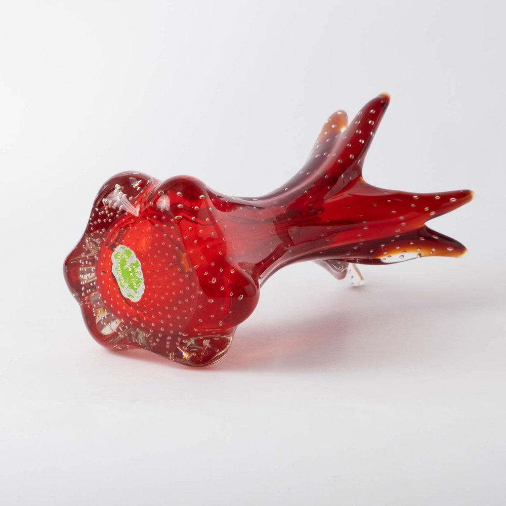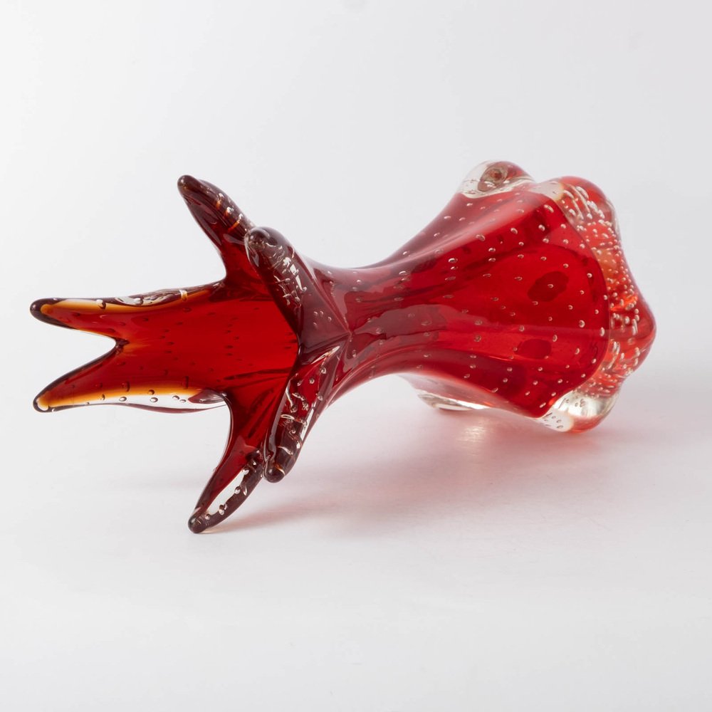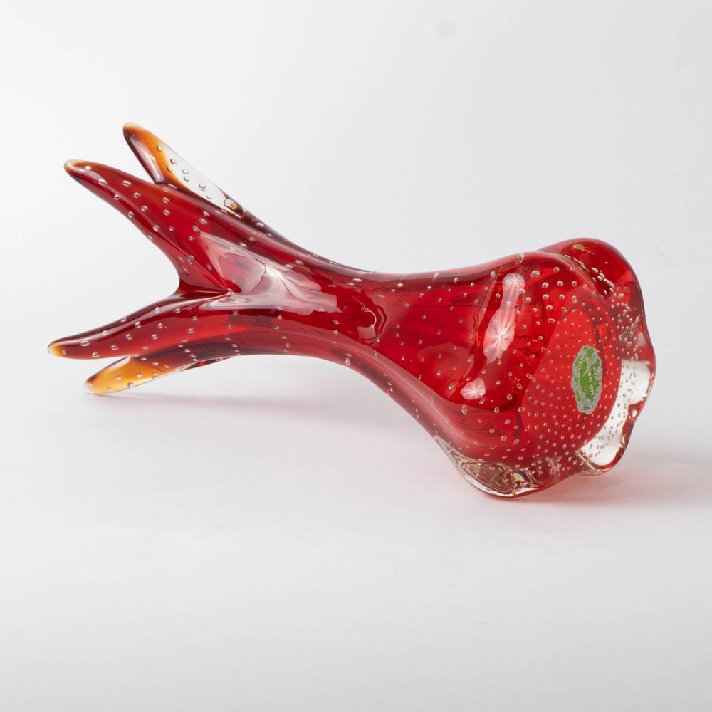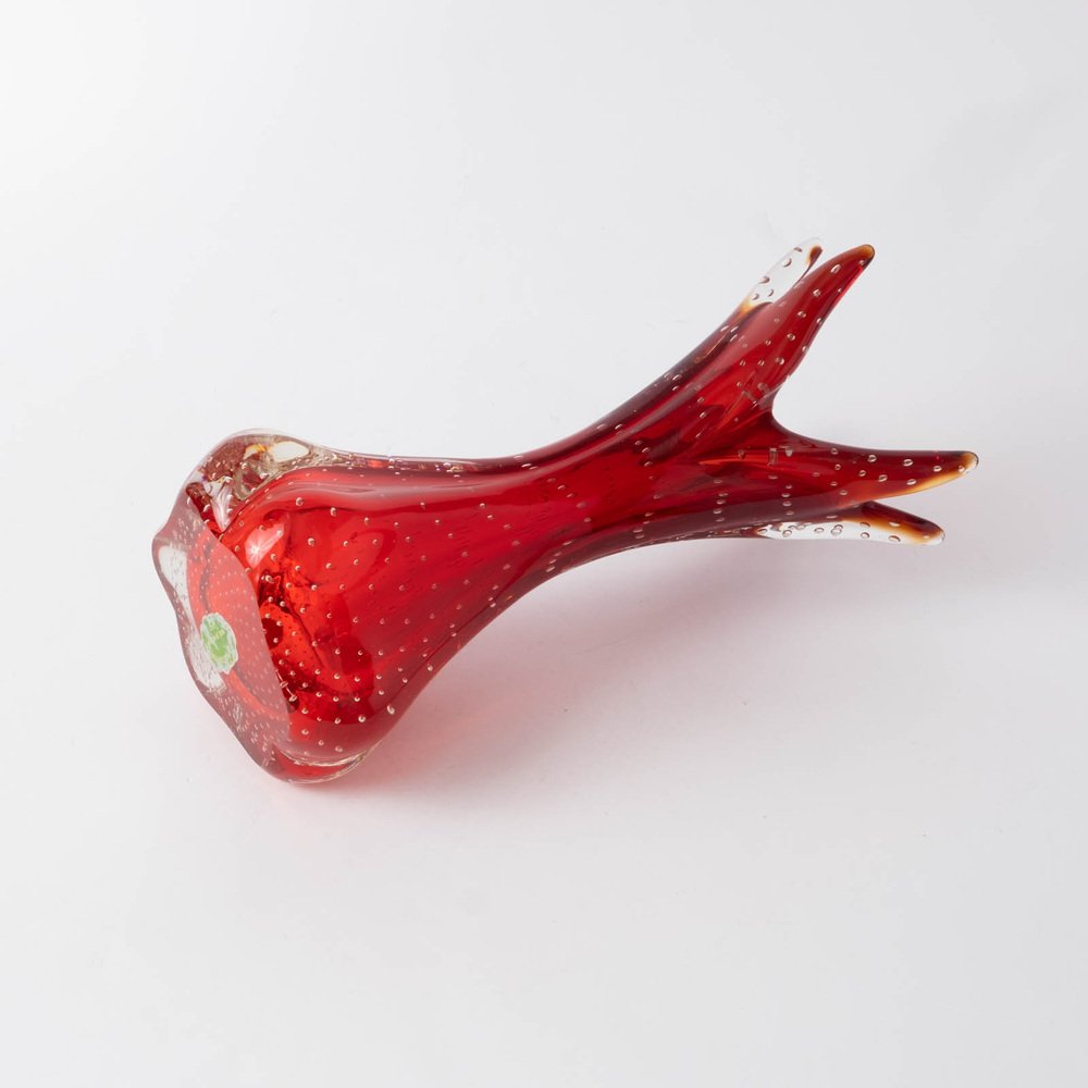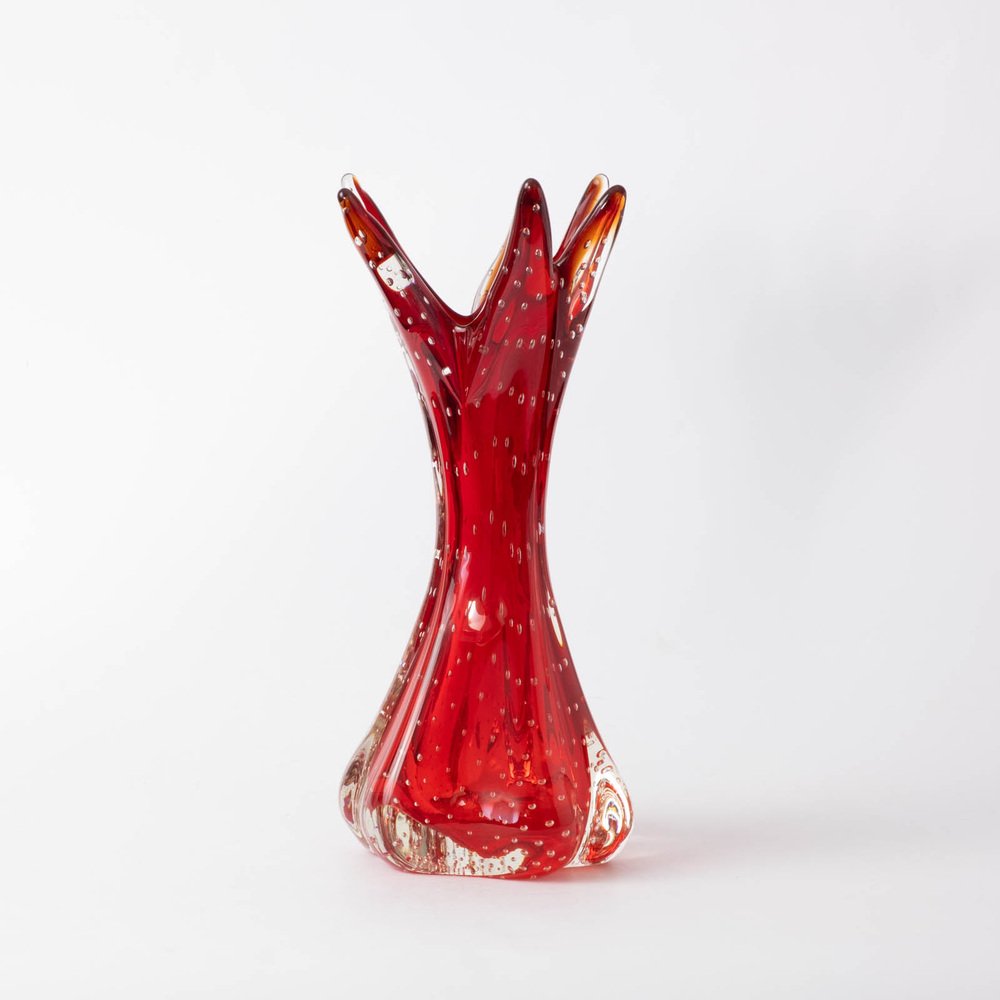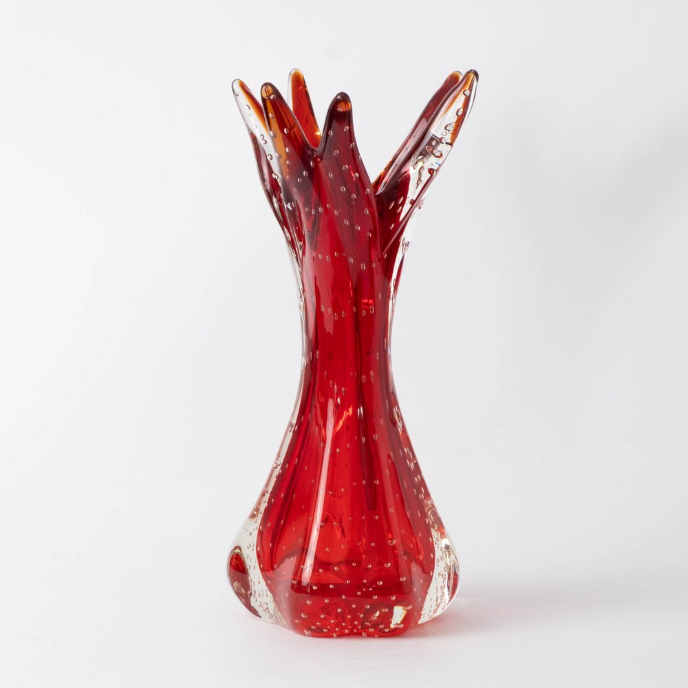Wazon z czerwonego szkła Murano zdobionego techniką bullicante. Wynaleziona przez Włochów technika bullicante polega na umieszczeniu w szkle regularnie rozmieszczonych bąbelków powietrza. Nadaje to wyrobom bardzo dekoracyjny, trójwymiarowy efekt. Wazon został wykonany ręcznie we Włoszech na weneckiej wyspie Murano w latach 60. XX wieku.