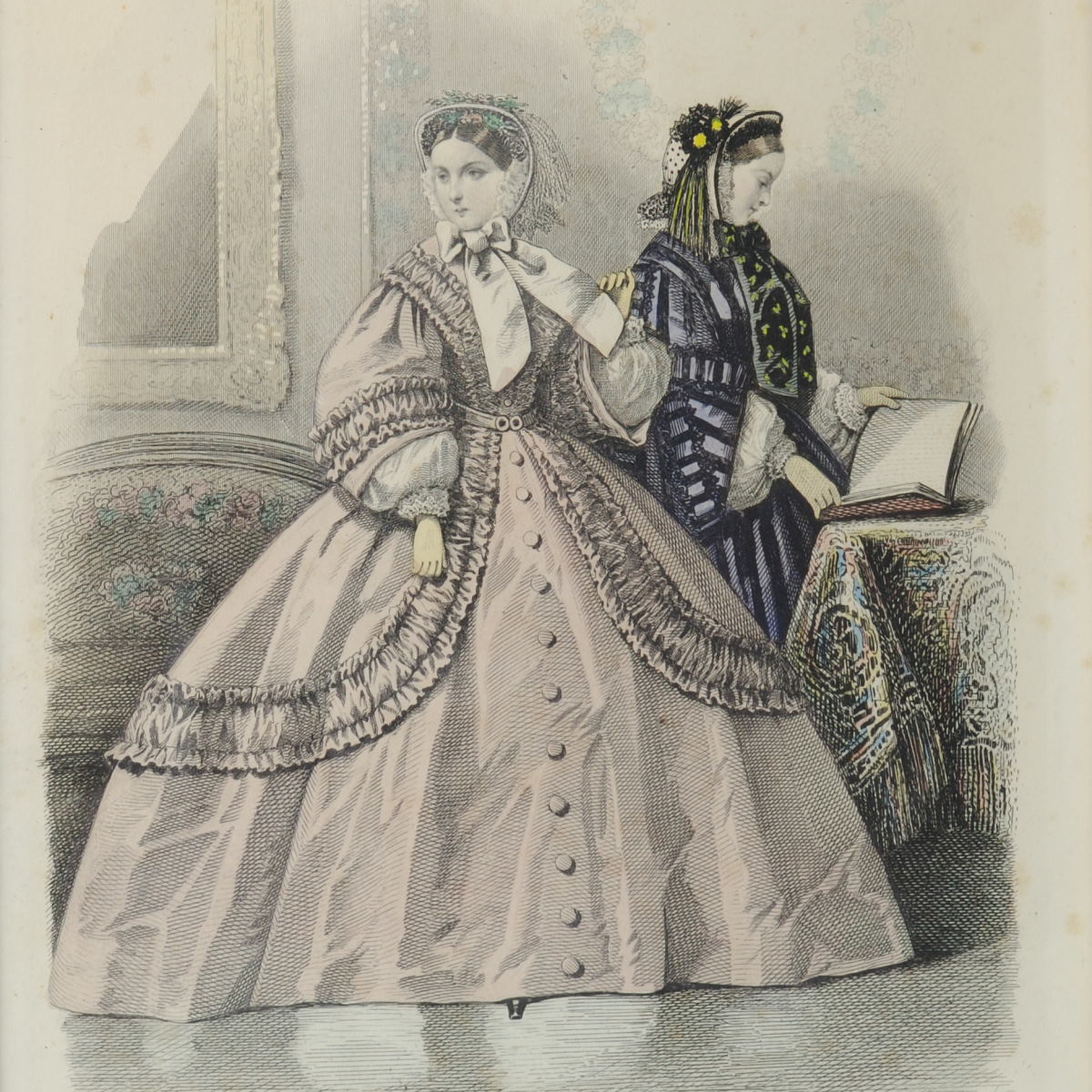 Para grafik z modą damską powstałych około 1860r. w Paryżu. Pochodzą z czasopisma L’Ami des Dames. Oprawione w latach 50. XX w.