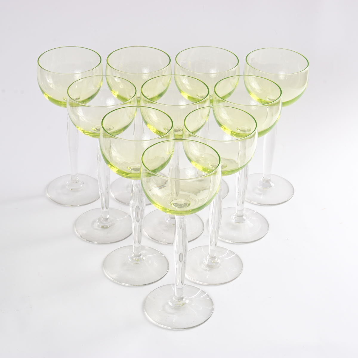 Komplet dziesięciu kieliszków wykonanych na początku XX wieku. Czarki zostały wykonane ze szkła uranowego, w świetle UV widoczna jest fluorescencja. Dwa kieliszki posiadają minimalne uszkodzenie na krawędzi czarki.