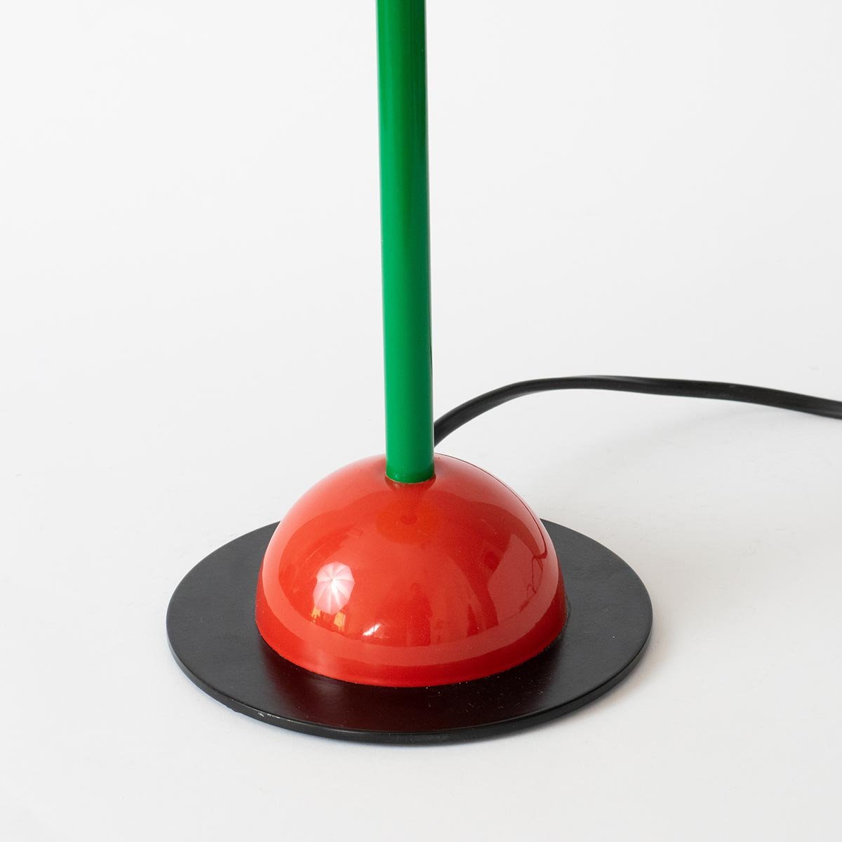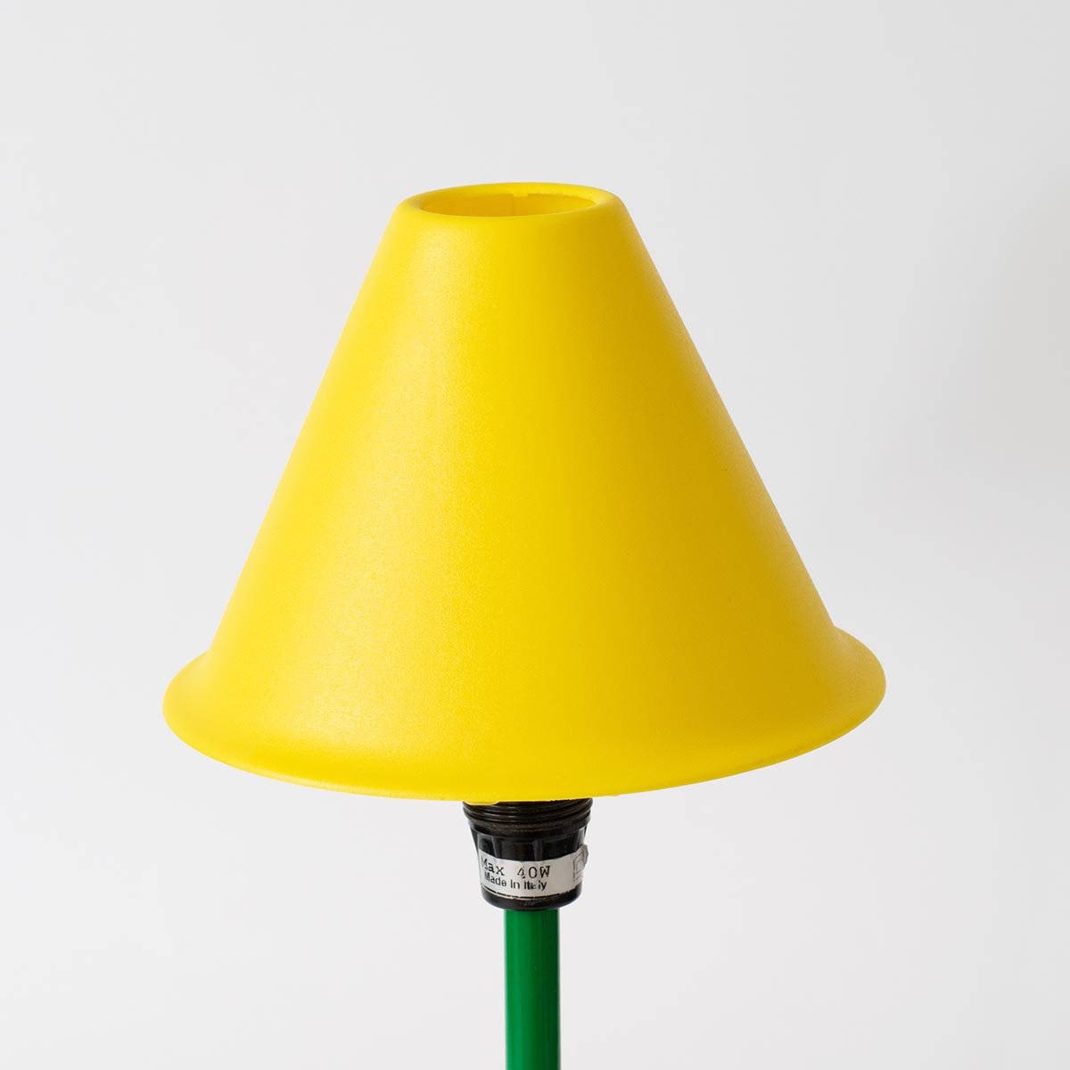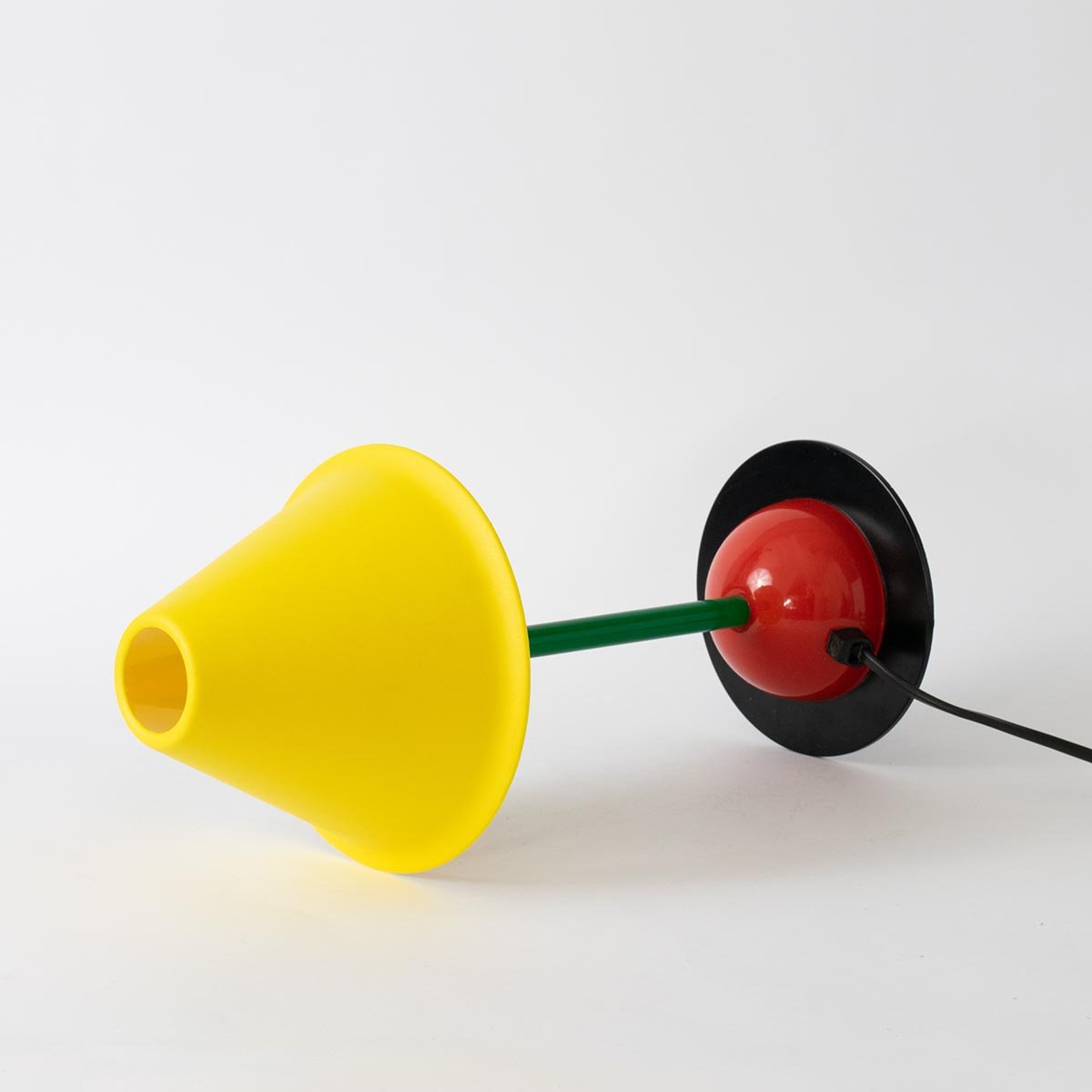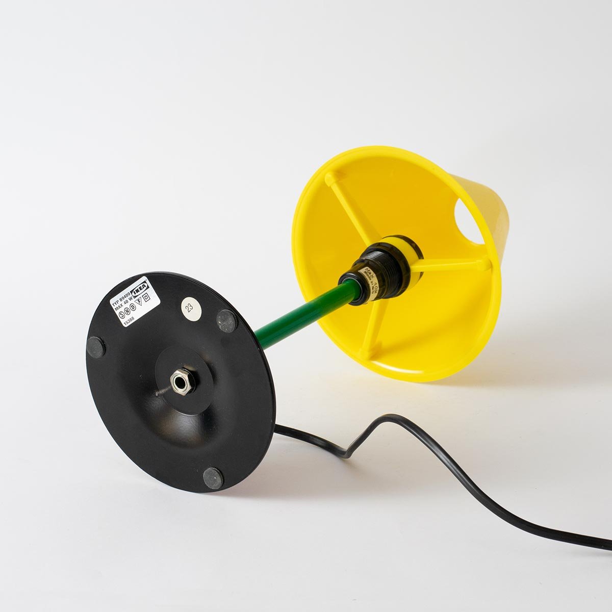 Wielokolorowa lampa stołowa marki Ikea w stylu postmodernizmu. Podstawa wykonana jest z metalu, a klosz z żółtego tworzywa. Lampa powstała we Włoszech w latach 80. XX w. Wykorzystuje jedną żarówkę typu E14.