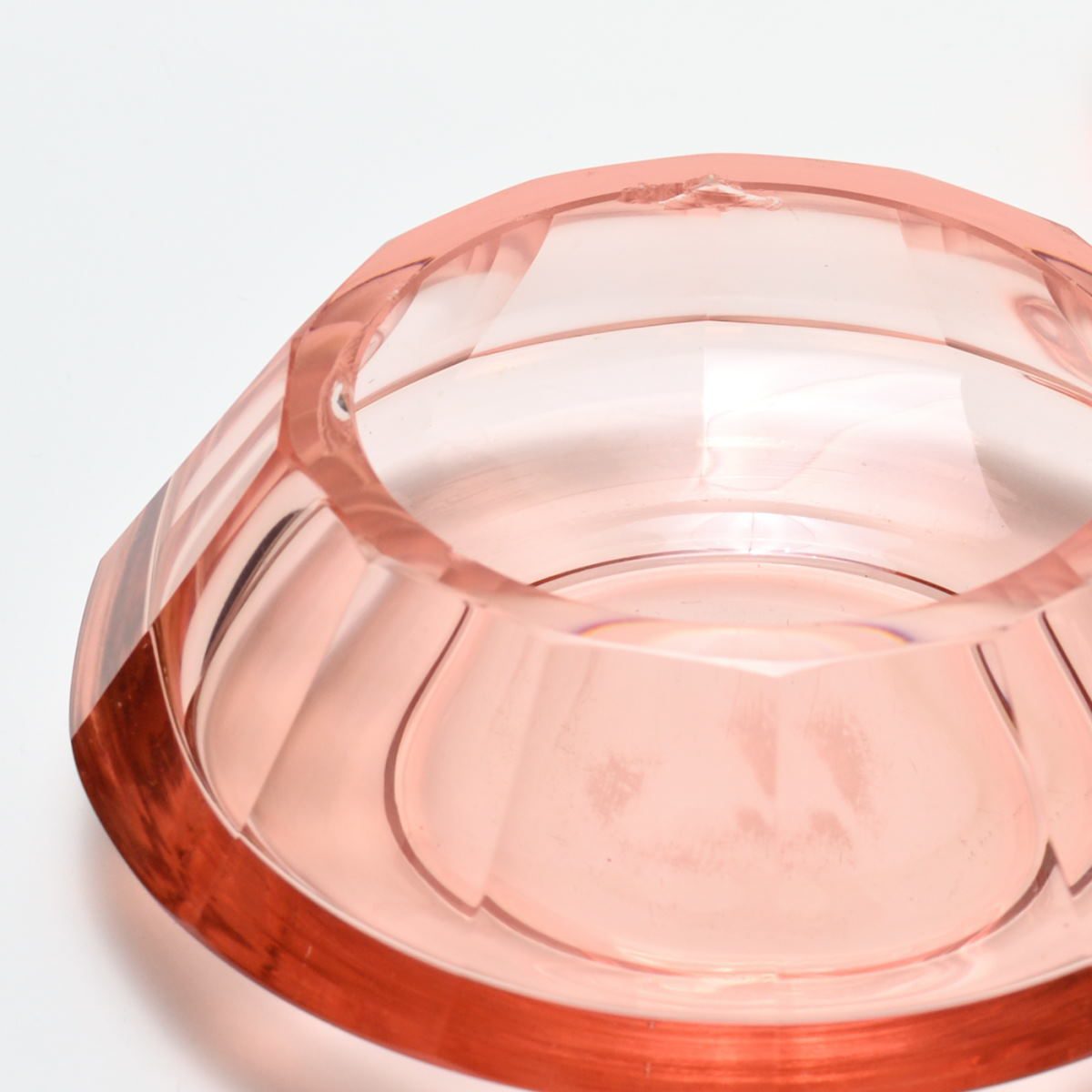 Pojemnik w stylu art deco pochodzi z Czechosłowacji z lat 30. Wykonany jest z łososiowego szkła kryształowego. Posiada odprysk szkła na wewnętrznym rancie.