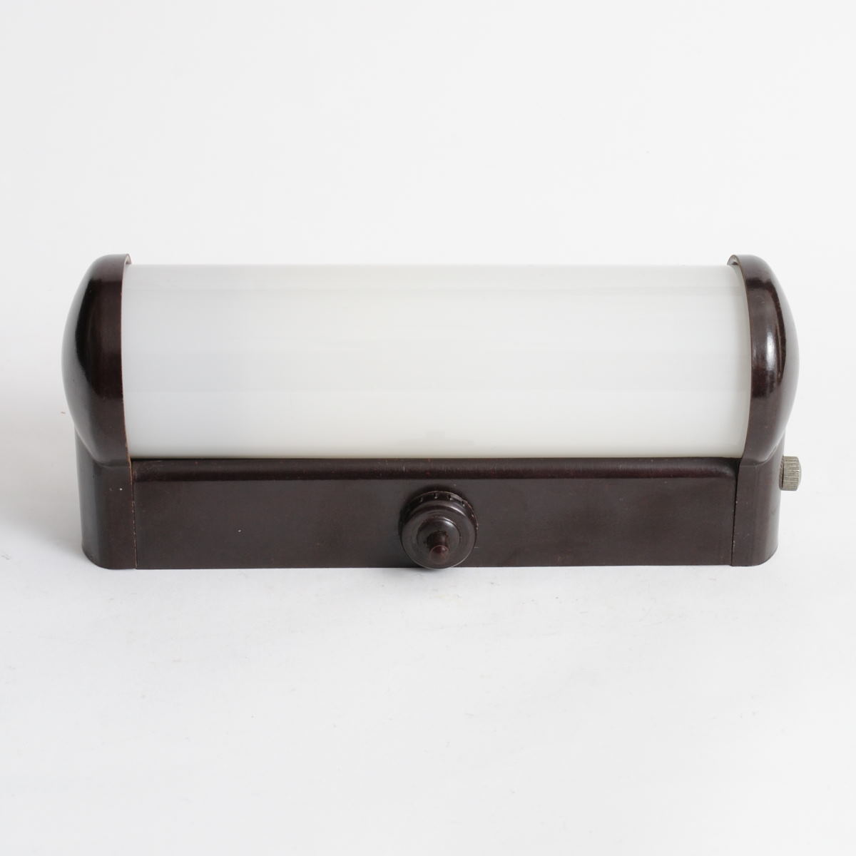 Lampa ścienna wyprodukowana w latach 50. w Czechosłowacji przez ESC. Wykonana została z bakelitu i mlecznego szkła. Zachowana jest w bardzo dobrym stanie.