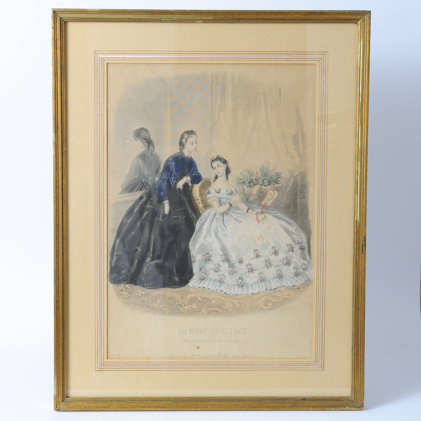 Para grafik z modą damską wydanych około 1863 r. w Paryżu. Pochodzą z czasopisma La Mode Illustree. Oprawione w na początku XX w. Ramki ze śladami renowacji.