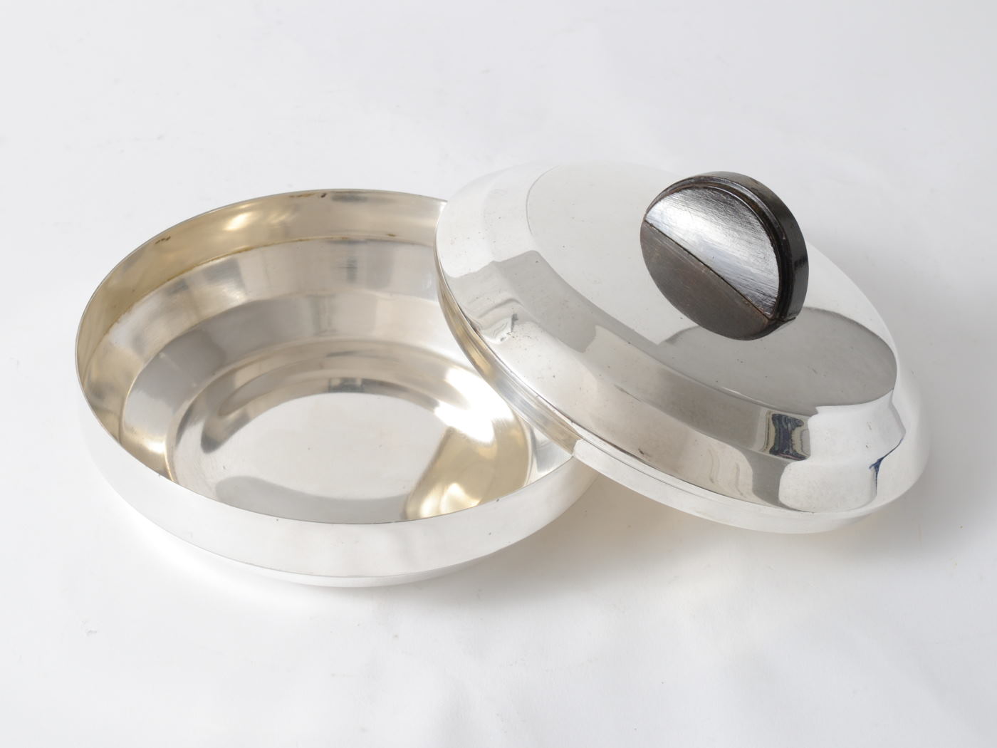 Metalowe puzderko – puszka w stylu art deco. Wykonane z platerowanego srebrem mosiądzu, zwieńczone drewnianym uchwytem. Puzderko powstało w Belgii w latach 30.