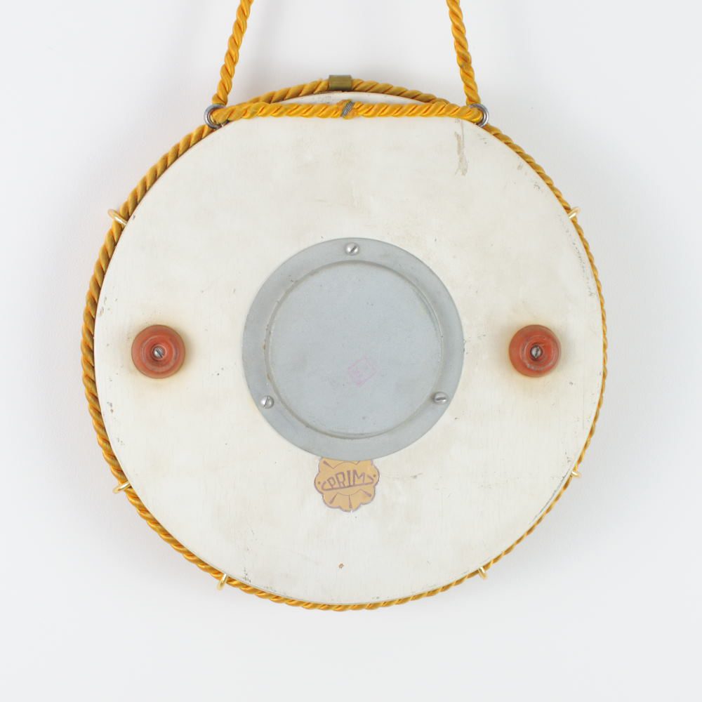 Zegar wiszący marki Prim powstał w latach 50. w Czechosłowacji. Zawieszana na tekstylnym sznurze tarcza, została wykonana z malowanego drewna z aluminiowymi i plastikowymi aplikacjami. Zegar jest nakręcany, w komplecie oryginalny klucz. Mechanizm przeszedł kompletny serwis zegarmistrzowski, działa punktualnie.