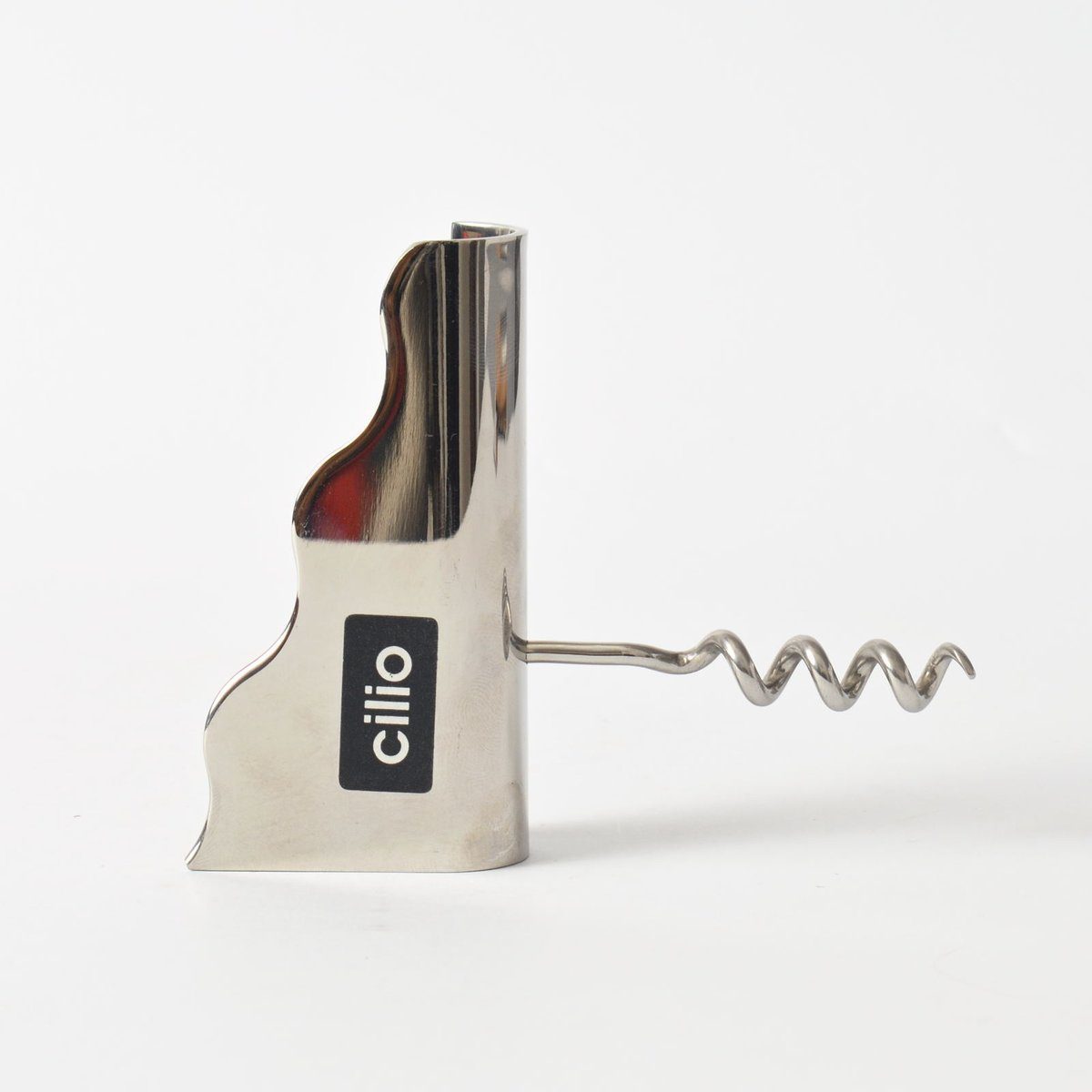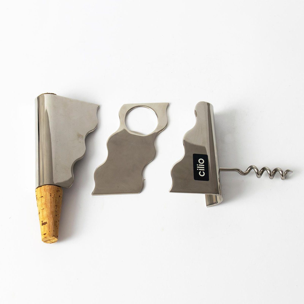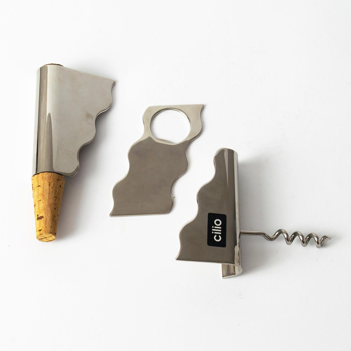 Zestaw akcesoriów barowych marki Cilio, obejmujący korkociąg, otwieracz do butelek oraz korek. Utrzymany w estetyce postmodernizmu. Wyróżnia się miękką, falującą formą, o lekko żartobliwym charakterze – bardziej projekt niż czysto techniczne narzędzie. To przykład codziennego przedmiotu potraktowanego z dystansem, typowym dla projektowania końca XX wieku.